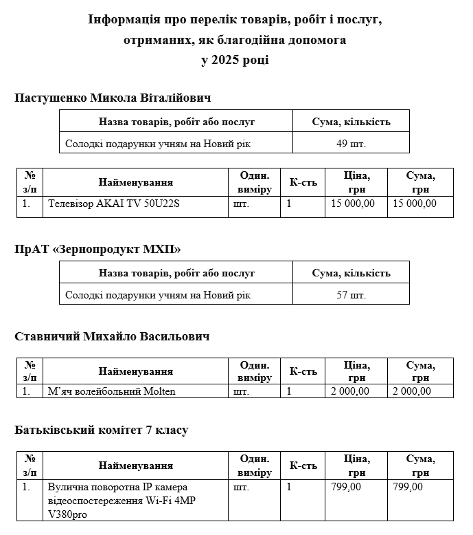 Інформація про перелік товарів, робіт і послуг, отриманих як благодійна допомога у 2025 році